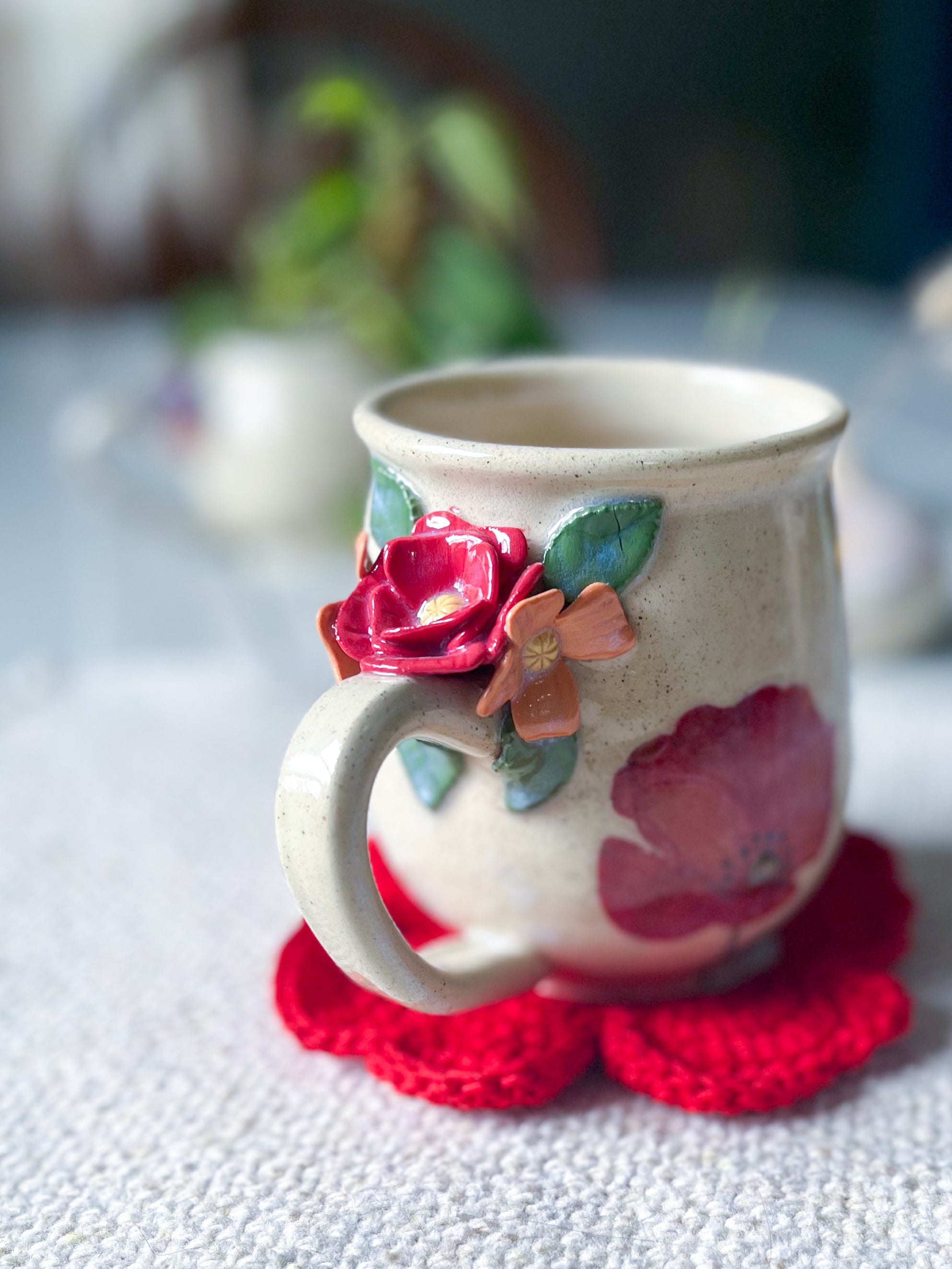 • A complimentary handmade coaster by Thirty-Nine Threads is included with this mug.